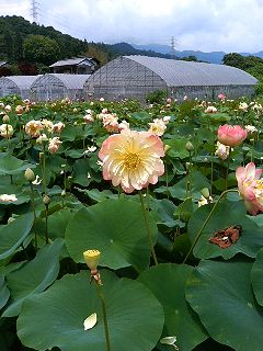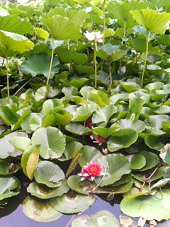 温室内の池に、パラグアイオニバスの花が浮かんでいました。 ハスは、ゴマやカンピョウの植えてある農園脇に数輪が咲いていて、多くの株は既に実をつけていました