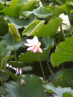 小合溜のハスでございます。周りに咲いているスイレンやコウホネと比べると、葉っぱに隠れて控えめに咲いていました。 |