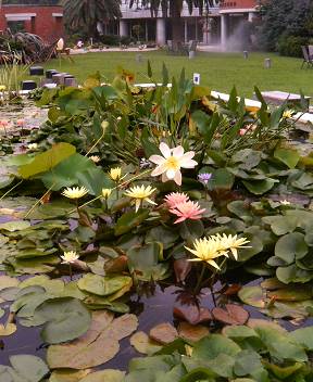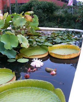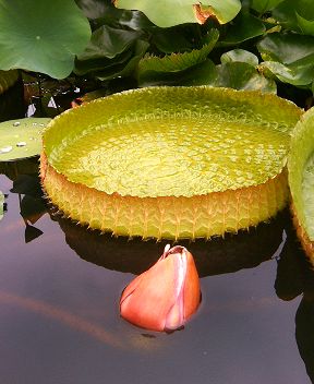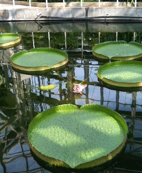 植物館の前庭には2つの池があり、スイレンとハスが池一杯に花を咲かせていました。 右の写真のパラグアイオニバスはまだ蕾です。