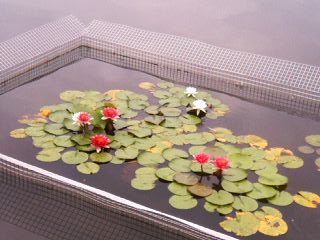 貯木場を模した四角い池に、白いスイレンが咲いていました。 噴水で水浴びをしているようにも見えました。