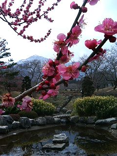 | 芝桜で有名な公園ですが、小さな梅林もあります。花の向こうに武甲山がそびえます。 |