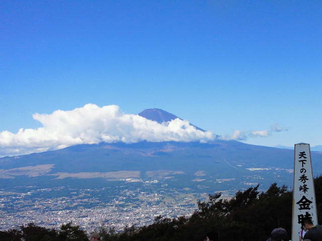 大混雑の山頂からは、頭を雲の上に出した富士山を望めました。