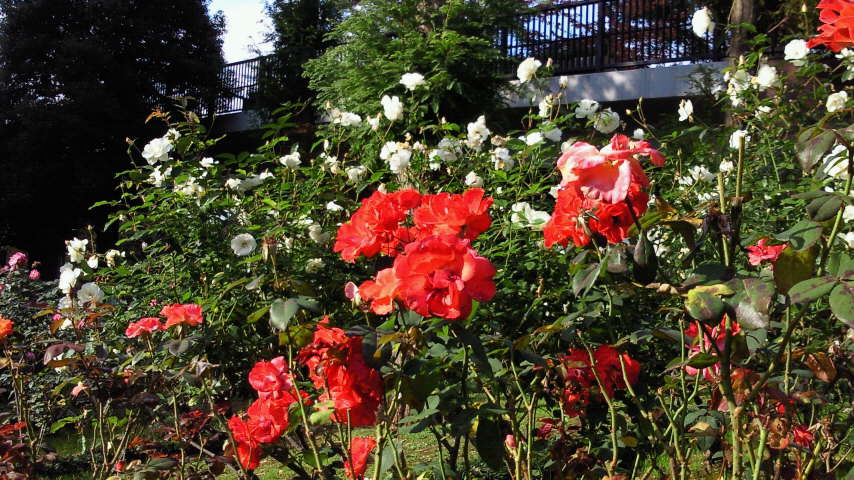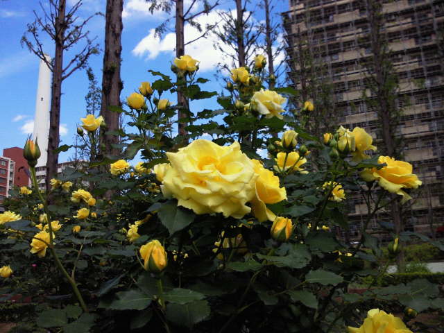 初夏を思わせる空の下で、バラが賑やかに咲き始めました。
