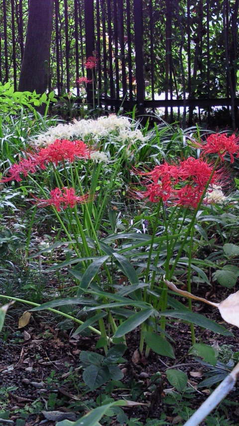 雑木林の足元では、紅白のヒガンバナが咲き始めていました。