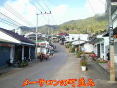 ふもとから小一時間でようやくメーサロンに到着した。看板には「美斯樂」とある、中国名だ。ここは中国共産党への反撃の機会を伺っていた中国国民党(台湾と同じ)の人たちが開いた村だそうだ。現在は武装解除をしてタイの国籍を有しているのでタイ人ということになるが、村の中は中国語が圧倒していた。それから、さすがにこんな奥までは上がってこないのか、さっき見た観光バスの一団の姿は見えなかった。空気は冷たかった。町並みといい、坂道といい、初秋の箱根に来ている様な錯覚を覚える。これで温泉でもあれば言うことなしだ。ソンテウが停まる雑貨屋の前から少し上がると2軒のゲストハウスがあった。そのうちの一軒、新生旅舎(ロングレーム・シムセー)はバンガローもあるようなので値段を訊くと提示は300バーツだったので、200バーツに負けてもらってチェックインだ。宿帳に名前を書こうとすると、3日前から誰も泊まっていないらしく、宿のお姉さんは照れ笑いを浮かべる。通されたバンガローは布団一組と大きな鏡、トイレとホットシャワーがついていたが、残念ながらこの村に温泉は無かった。
