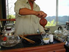 僕がこのメーサロンに来てみたかった理由のひとつが、ここでは中国人の手によっておいしいお茶が栽培されてるからだった。山の上から見てみても至る所に茶畑が広がっている。お茶を摘んでいるのは全てアカ族の女性たちだ。通りには多くのお茶屋さんが並んでいる。お店の方は色々と漢字を書いて説明してくれ、必ず試飲を勧めてくる。細かい説明は避けるが、本式のお茶の入れ方は興味深い。特に「聞香杯」という陶器にお茶を注ぎ、そのお茶を湯飲みにあたる「品茗杯」に注いだ後、空になった「聞香杯」に鼻をつけ茶の香りを嗅ぐというところは、まるでソムリエがワインを空けて客にコルクの香りを嗅がせるのに似ているなと思い、お店の人の真似をして自分もその気になって香りを聞いてみた。それにしてもどの店で飲んでもおいしい。日本の烏龍茶とは全く別物だ。通常淹れた烏龍茶は茶色と言うのが日本人の常識だが、実は黄色がかったものと茶色のものと2種類あった。店主の話しでは黄色いお茶の方が高級だそうだ。ということは日本人はあまり良くない烏龍茶を飲んでいると言うことか?サントリーの烏龍茶はコマーシャルで「一級茶葉のみ使用」と謳ってたと思ったが、一級=最高級と言うわけじゃなさそうだ。