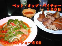 料理が出てくることになると客の数は全部で15人を超えた。まずはヤム・バイチャーにトライ。少し口にふくんでみるとどこかで食べた事のある味だった。茶葉や野菜・香辛料を掻き分けて下を見てみると、そこにはイワシの身がまるごと3匹分あった。タイにはプラー・カッポン(缶詰の魚)という缶詰がある。これは脂ののったイワシのトマト煮で、一缶10バーツ程度、何故だか貧乏人にとても人気がある。そんな油っぽいイワシの身だが、生のお茶の葉と和えることで油っぽさが軽くなっていてなかなか美味しい。続いて彼女のおすすめ、ペット・オップ・バイチャーをかじってみた。茶葉を使い燻製にしたアヒルの身を油で一度揚げている。僕はアヒルはくせがあるのであまり好きではないが、これに関しては超オススメ。ビールのつまみには最高、いくらでも食べられる。ビールを継ぎ足してくれるブーチューちゃんにすごく美味しいと伝えると、ニコニコ笑って応えてくれる。お勘定は全部で225バーツだったが、彼女へのチップと合わせて300バーツ渡し、ほろ酔い気分で店を後にした。子供にチップと言うのはあまり好ましくないので、今度来る時は何かお土産を持ってこよう。