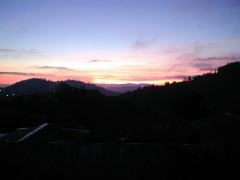 メーサロンの夜は予想通りかなり冷え込んだ。部屋にはやや厚めの掛け布団があったが、僕は更にフリースのジャンパーを着込んで布団に入ったほどだ。翌朝、朝陽を見ようと5時半に起きる。とりあえず顔を洗っただけで表に出た。普通の呼吸ではならないが、「ハァ〜」とすると息が白くなった。もう東の空がやや明るくなり始めている。眺望の良いところを求めて歩き回る。途中野菜を担いだ少数民族のおばさんと何度もすれ違う。たぶん市場に売りに行くのだろう。今日は麓のほうは霧が出ていないらしく、残念ながら雲海は見られなかった。だが、やはり陽がのぼるところは何度見てもいいものだ。朝陽に向かい普段の不摂生を反省する。