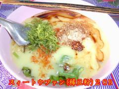 市場の中には朝食がとれる店もある。パートンコー(揚げパン)とナム・タオフー(豆乳)を頼んだら、さすがお茶どころ、小さなグラスに烏龍茶も注がれてでてきた。この朝食はバンコクでもよく摂るのでこれといって変わったことは無かったが、その店のおばさんが食べているポタージュのようなスープの麺が気になった。どこで買ってきたのか訊くと、手を引いて連れて行ってくれ、頼んでくれた。その麺料理はスィートウファンと言って、中国の麺料理だそうだ。近くのおじさんが紙に漢字で「稀豆粉」と書いてくれた。麺は太目のうどんのような感じ、トロッとしてクリーミーなスープは意外とあっさりしていて朝の胃袋にやさしかった。これもおすすめだ。