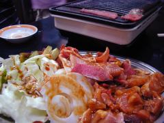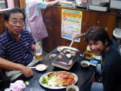 後から来るT−Jrさんを待たずに、焼肉とビールで始めることにした。焼肉は飾り気の無いスチールの大皿に野菜と合わせてどっさり、コンロは昔懐かしい家庭用ガスコンロ。食通の人が見たらひっくり返ってしまうような状況だけど、僕は高級レストランやチェーン店より、こうして独特の雰囲気や味のある店が好きだし落ち着く。