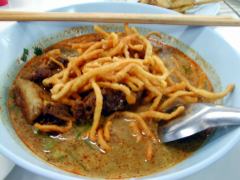 2月13日(チェンマイにて)![]() 今日はロケの時の昼食に、チェンマイで一番人気があるカオ・ソイの店に行った。カオ・ソイとは、太めの小麦麺にしっかりと煮込んでカレー粉とココナッツミルクで味付けした鶏スープをかけ、さらに上から油で揚げた麺を載せたものなんだけど、例の鳥インフルエンザ騒ぎのせいで店側が自主規制で鶏を止めてしまった。だから具は豚になるのだけど、やっぱりこれはちょっとイマイチだったな。もし鳥インフルエンザにかかってても、75度以上で10分間加熱すればウィルスは死ぬんだから全く問題ないはずなんだけどね。あぁ、何だか無性に鶏が食べたくなってきた。 |