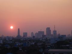 12月1日 ここのところのバンコクは陽気も良くなって、毎日夕焼けで空がオレンジ色に染まる。そんな光景を写真に撮ろうと思ったけど、ズームが足りなくて「太陽にほえろ!」はできなかった(20代以下の人は気にしないで下さい)。ただ、沈んでいく夕陽を見て気付いたんだけど、雲ひとつ無い晴天なのに、夕陽がビルの高さぐらいにまでなると急激にそのパワーを失っていく。これはおそらくバンコクの上空を低く覆っているスモッグのせいだろう。サングラスをかけなくても夕陽を見つめる事がでてしまうのだ。しかも目に焼きつく事も全く無い。同じタイでも田舎に行くと、夕陽は地平線にくっついても力強く輝いている、まるで「野生の王国」のように(これも30代以上限定)。僕はこんな所に住んでいるのだ。 |
