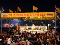 12月21日 今朝は予告通りお寺にタムブンに行ってきた。バンコクのお隣り、ノンタブリー県のチャオプラヤー川沿いにあるソーイ・トングというお寺で、毎日朝から夕方までタムブン式が行われている有名なお寺だそうだ。タクシーで到着した僕らは入り口で靴を預けその際に簡単なお布施をし、さらに蝋燭と線香、蓮の花、封筒のセットも簡単なお布施をして受け取り、小さめの講堂のようなところでお坊さんが来るのを待った。通常はタムブンをする人の前に使いまわしの献上品が並べられて、それと一緒にさっきの封筒にお布施を入れお坊さんに差し出すのだけど、今年の僕は本当に運が無かったので、使い回しじゃなくきちんと1セット199バーツで新しい物を買い、さらに別に封筒の中にもお布施を入れ式に臨んだ。 最初に拝みながらお経を聴き、続いてお布施と献上の品をお坊さんに渡した。さらに真鍮製の徳利のような物に水が入っていて、それを同じく真鍮製のおちょこのような物に移し、それらの水を集めた水瓶の水をお坊さんがほうきの様な物で参加者に振り撒き、さらに参加者全員がすっぽり隠れるくらいの大きな白い布が出てきて、まるでサッカーのサポーターにでもなったようにみんなで中に入ってお経を聴いた。そして最後はお坊さんにオデコに蝋燭を筆代わりに白い液体で3つの点を書いてもらい、これでタムブン式は終わりだ。続いて外に出て別にある仏像を拝み、おみくじを引く。僕はおみくじは良かったためしが無かったのだけど、今日引いた23番の札はいい事尽くめで、早速タムブンの効果が出ていた。そのあと占い師に見てもらっても、昨日から僕の運勢は急上昇すると言われた。そう言えば、昨夜失恋相手から電話があって、まるで青春ドラマの一幕のような熱い話しをしたっけ。これからは公私共に忙しくなりそうだぞ!! |