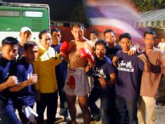 12月6日 昨日は、大晦日にK-1Dynamaite!!で魔裟斗と対戦する山本“KID”徳郁選手の写真集の撮影に同行した。昼間は街中やウイークエンドマーケットなどに行って、夜は彼の後輩が出場するムエタイの試合が開催される王宮前広場に行った。出場するのは福田力(りき)選手と言って、修斗のアマチュア大会でチャンピオンになり、3週間前から山本選手と一緒にバンコク郊外のセンティアンノイ・ジム(過去のムエタイの偉大なチャンピオンのジム)で修行をしてきて、今日がムエタイ・デビューのはずだった。ところが、対戦相手が前日の軽量に現れなかったので、施工者は試合が無いと言う。そこへ現れたセンティアン会長とその奥様が施工者に猛烈に抗議して、なんとか23時30分からスウェーデンのピーター・アンダーソン選手との試合が組まれた。 センティアン会長が彼は新人なので2ラウンド制だと言うので、僕はそれを彼に伝えた。ところが、前の試合がKOで決着が着いたので、施工者側が急に5ラウンド制に変えたらしく、会長もそれを力選手に伝えたらしい。でも力選手は全く理解していなくて、1Rのゴングとともに猛烈にスパートしていった。なので4Rにはだいぶ動きが落ちたので反撃も食らったけど、何とか判定で勝利する事ができた。試合後の力選手は、対戦カードが直前まではっきりしなかったり、2R制が急に5R制に変わったり、海外に出たら話し半分で聞いておかないといけないことがわかったいい経験だったと言った。僕は格闘技にはほとんど興味が無いのだけど、山本選手はとても礼儀正しくて僕と波長が合うタイプだし、力選手もとても純でまじめな人なので、これからも応援していきたいと素直に思った。 |