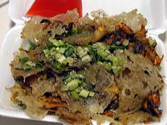 | 2月2日@ 僕が好きなタイの屋台料理の中に“ホーイ・トート(ミドリ貝のタイ風お好み焼き)”という料理がある。これはミドリ貝(ムール貝?)を米の粉と混ぜて焼いた物で、屋台が集まっている所ならばだいたい1軒くらいはある。だけど僕的にはけっこう好みがあってカリカリになるまで焼いたのが好きなんだけど、僕好みに焼いてくれる所がなかなか無いのだ。なので知らない所ではあまり食べない料理でもある。 もっぱら最近は僕のアパートの近くにあるカラオケ屋の前で焼いているのがイチオシだ。ここは基本的にはいつもいるおじさんが焼いてるんだけど、カラオケ屋の中の料理の注文が多かったりするとアルバイトの兄ちゃんみたいなのが焼くので、そんな時は諦めて帰ることにしている。このおじさん、何が上手いって、僕好みにカリカリに焼いてくれる技術が素晴らしいのだ。カリカリに焼いて欲しい時は“クロープ、クロープ”って言うんだけど、前にアルバイトの兄ちゃんに焼いてもらった時はぐちゃぐちゃで全然美味くなかった。右の写真は全然ウマそうに見えないけどそのおじさんが焼いた物で、今食べながら書いてるけどやっぱりうまい。カリカリに焼くと冷めてもイケルしね。左上の赤いのはタイのチリソースで、僕はいつもこれにマナーオ(タイのレモン)とタバスコを加えて使っている。このおじさんは焼くのに10分ぐらいかかるのだけど、一人前何とたったの25バーツ(約60円)!今日も酒がすすみます。 |