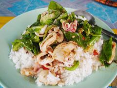 | 2月12日@ 今日は久々にタイ語学校へ通っていた頃によく食べにいった食堂に行った。ここは何が美味いって、豚挽き肉を揚げたタイ風メンチカツが超絶品なのだ。揚げたてをハフハフ言いながら食べる。軽くハーブが利いていて、何ともいえない絶妙な味がする。やっぱりタイ料理ってウマイ。 |