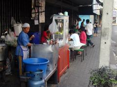 2月27日@ 僕はいつも近所にある道端の簡易食堂で朝(or昼)食を食べている。ここは基本的には炒め物系のタイ料理をご飯にかけて出す“アハーン・ターム・サン(注文食堂)”という形をとっていて、野菜と具の組み合わせと調理法で注文する。野菜はキャベツ・白菜・アスパラ・ブロッコリー・カリフラワー・トマト・芽キャベツ・カナーなど、具は鶏肉・豚肉・牛肉・鳥内臓・エビ・イカ・豚バラ肉揚げ・タイ風サワーソーセージなどがあって、それらを大盛りの白ご飯にかけて(チャーハンも有る)1人前20バーツ(約55円)でお腹がいっぱいになる。 そこで最近僕がはまっているのが左の芽キャベツとイカの炒め物で、オイスターソースとトーチー(タイ風味噌)で味付けしてあって日本人好みなんだけど、食べていてなんか身体にすごくいいような感じがするのだ。この店は朝6時ごろからおばちゃんが一人でやっていて、忙しい時は15分ぐらい待ったりするのだけど、そんな時この店に来るタイ人(裕福な人は100%いない)の行動を見ているとけっこう面白い。テーブルにはタイの新聞が置いてあるのだけど、待っている間タイ人は夢中になってその新聞を読んでいる。そして自分の料理がやってきても食べないでまだ読み続ける。日本人の大部分は出来立ての熱々を食べないと気がすまないけど、タイ人は猫舌なのでそんなのはお構いなしなのだ。それと、半分くらいの人がやってきた料理を食べる前にグチャグチャに混ぜてしまう。子供の頃、カレーを混ぜて食べるのを行儀が悪いと言われて育ってきた身には、何だかひとこと言いたくなる瞬間だ。 |
