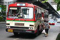 7月13日@ 8日からまたバンコクの市バスの料金が1バーツずつ値上がりして、一番安い赤バス(冷房無し、右写真)が6バーツ均一(約17円)になった。去年の1月は3.5バーツ(約10円)だったのだけど、この1年半の間に4バーツ→5バーツ→6バーツと約1.7倍にもなった。まぁ、日本にいる人からすれば10円が17円になろうがどうでもいいことだろうけど、割合からすれば現在200円の東京都バスが1年半の間に340円になったのと同じだ。こうなると地下鉄の安さが際立ってくる。事実、朝晩はもの凄い混みかただ。それから、タイの労働慣習では通勤の交通費は企業は負担せず従業員が負担する。なので交通費の値上がりはそのまま給料が減った事と同じなのだ、かわいそうに。 |