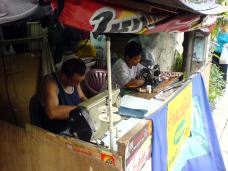 5月13日 ネットでユニクロの“ドライ2WAYイージーカーゴ”というパンツを買った。ナイロンでできていて、膝から下がジッパーでとまっていて切り離せるようになっている。Lサイズを買ったんだけど、軽くで本当に履きやすいのだ。ただ困ったことに短足の僕には丈がちょっと長くて、ズボンが少しずり下がり気味になると、裾をかかとで踏んでしまう。そこで膝した部分だけを近所の仕立て屋に持っていって、ジッパーから1インチ(約2.5cm)切ってもらうことにした。タイではどこにでもミシンひとつで仕事をしている人がいて、 現に今まで僕が住んだアパートの周りにも必ずこういった店(屋台)がって、ジーパンの裾あげなんて20バーツ(約60円)でやってくれるのだ。だけどタイにはこんなズボンが無いらしく、おっちゃんが不思議そうな顔をしてたのでちょっと嫌な予感がしてたんだけど、翌日受け取りに行ったらちゃんとできていた。しかも代金はたったの40バーツ(約120円)。この膝したをズボンに付けて歩いてみたら、もう絶妙な長さで最高。だけど膝しただけ切ったので、ジッパーのつなぎ部分が下のほうに付いていてちょっとバランスが悪いけどね。自分の店で買ったジーパンじゃないと裾上げもしてくれない日本からすると、こんな店とっても便利だよね。 |